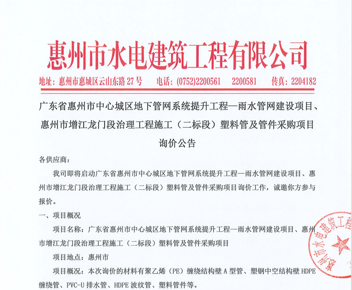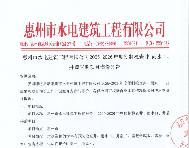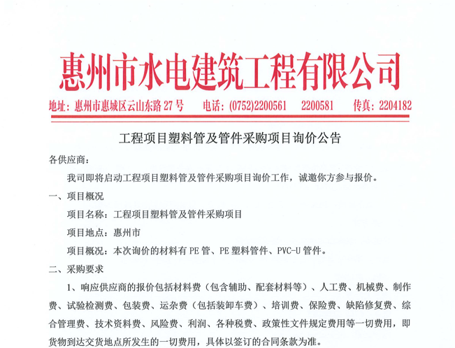 惠州市水電建筑工程有限公司成立于一九六四年四月,隸屬惠州市水務(wù)集團(tuán)有限公司,是一家國(guó)有綜合性施工企業(yè),主營(yíng)水利水電工程、房屋建筑、市政工程等施工業(yè)務(wù)。公司擁有水利水電工程施工總承包一級(jí)、建筑工程施工總承包一級(jí)、市政公用工程施工總承包一級(jí)、公路工程施工總承包三級(jí),公路路基、路面及建筑裝修裝飾專業(yè)承包二級(jí),環(huán)保工程、機(jī)電安裝、河湖整治、輸變電工程專業(yè)承包三級(jí)等經(jīng)營(yíng)資質(zhì)……